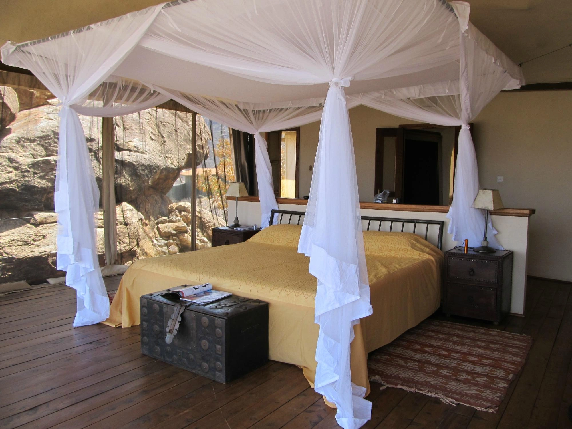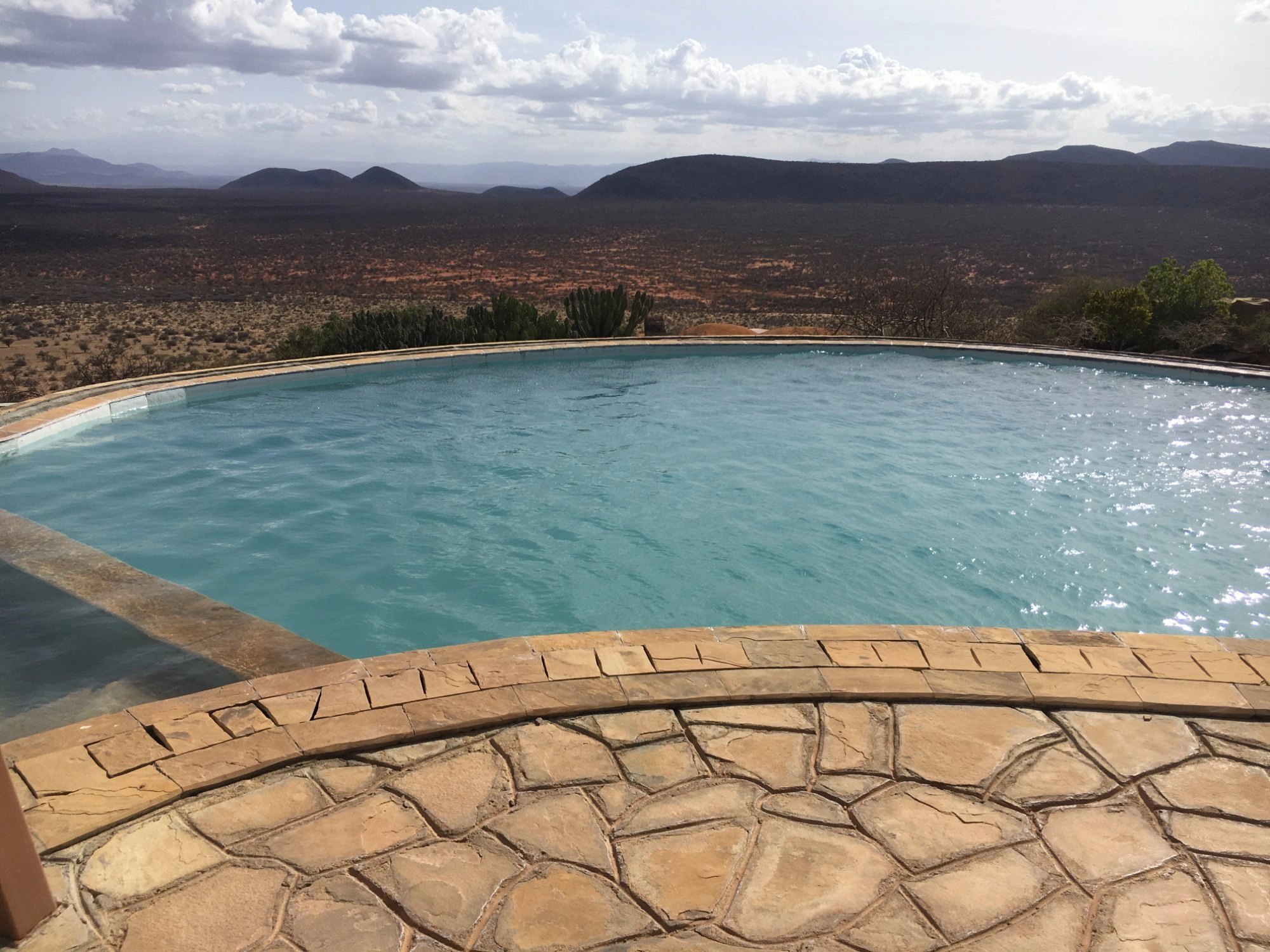 Saruni Samburu is a luxury resort in Kenya, located on a cliff in the Kalama Community Wildlife Conservancy, which provides some of the best accommodation in Kenya with magnificent views. The large spacious villas are brilliantly decorated with an authentic African look and feel, including African décor and artefacts in addition to an en-suite bathroom, indoor and outdoor showers and beds with mosquito nets for comfort. The shared area for guests was grand, with a community living/dining area, memorable views of a waterhole, and delicious gourmet food, which includes sumptuous breakfasts, lunches, and dinners; three meals a day; soft drinks; wines; and beers -- all very welcome after a day of safari!